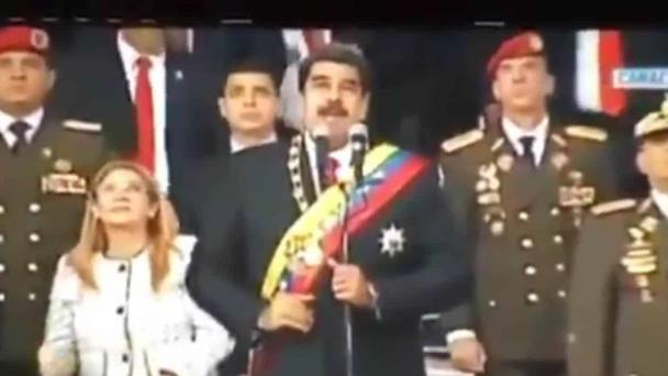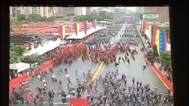 En un fragmento de la retransmisión televisiva del acto distribuido en redes sociales se aprecia como Maduro, su esposa y los presentes en la tribuna miran al cielo durante el discurso. De pronto, hacen un gesto como si se protegieran de algo. El sonido de la retransmisión se corta en ese momento y se oyen voces confusas. Entonces, se ve desde otra cámara a los militares que formaban en el desfile romper filas y salir corriendo. Ahí acaba la retransmisión.