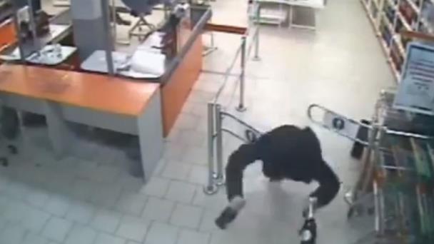 Un video muestra el momento en el que un ladrón se golpea con las puertas de seguridad de un supermercado ruso durante su huida
