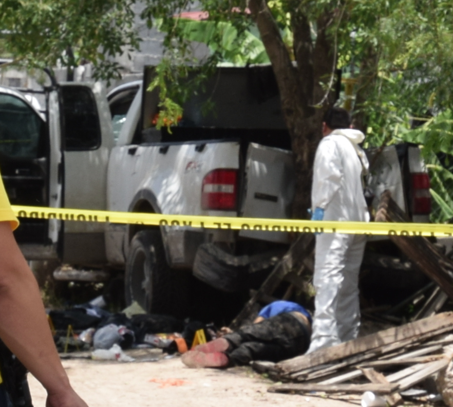 EN LA ESCENA. Atrás de la camioneta blindada, inerte en el suelo, se observa el hombre armado que fue abatido por marinos y agentes estatales en la colonia Ampliación Pedro J. Méndez.