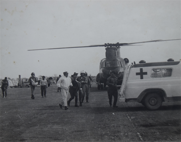 ‘Meme’ Garza Gonzáles, pilotos del Ejército de los Estados Unidos y personal del Ejército de México, coordinando el traslado de pacientes traídos por helicóptero al Aeropuerto de Reynosa; antes de ser llevados en ambulancia a la Clínica de Pemex en 1967.