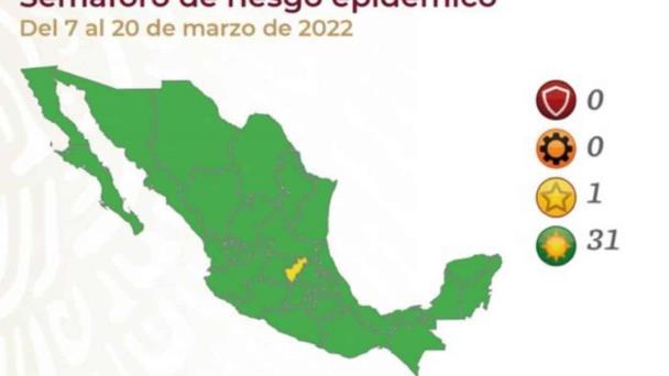 Del 7 al 20 de marzo 31 entidades federativas aparecerán en el color verde del Semáforo de Riesgo Epidémico Covid-19 que actualiza cada dos semanas la Secretaría de Salud federal.