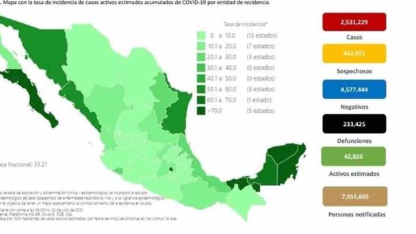 De acuerdo con el reporte técnico diario, actualmente hay 42 mil 826 casos activos estimados, es decir, personas que iniciaron con síntomas en los últimos 14 días, lo que representa el 1.6 por ciento de los casos.