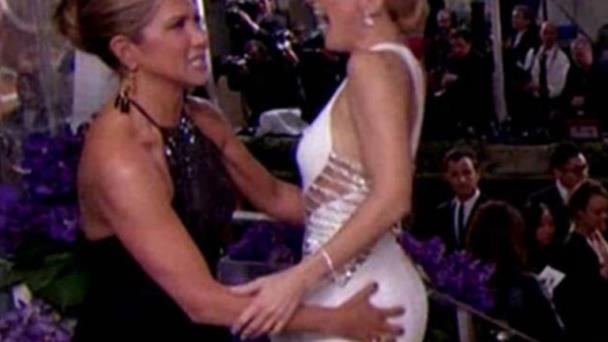 La actriz Jennifer Aniston sorprendió en la alfombra roja de los Globos de Oro al tocar el trasero de la también actriz Kate Hudson.