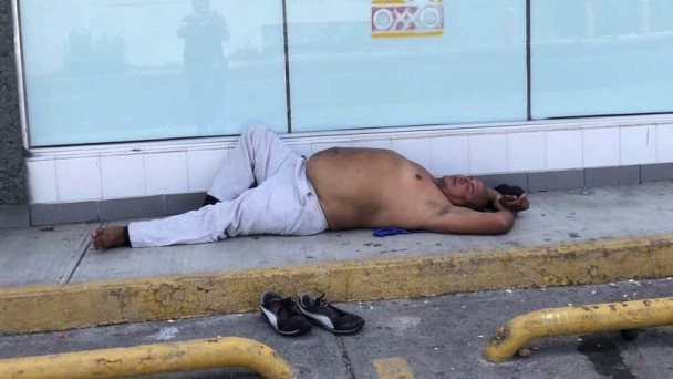 Posterior a permanecer dormido en la banqueta, el hombre corpulento decidió levantarse y empezar a pedir algunas monedas.