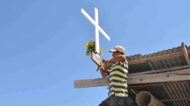 COLOCA. Los albañiles instalan la Santa Cruz como agradecimiento por contar con trabajo.