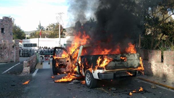 En la base militar de la capital del estado, incendiaron una camioneta del Gobierno local y lanzaron piedras al cuartel que estaba resguardado por soldados y policías estatales.