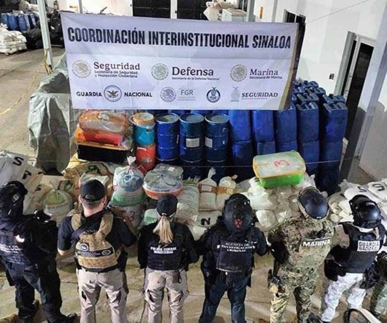 Culiacán, Sinaloa.- Autoridades federales y estatales aseguraron 4 mil 969 toneladas de metanfetamina, encontrados en tres inmuebles en Culiacán, Sinaloa, siendo el mayor decomiso durante esta administración.