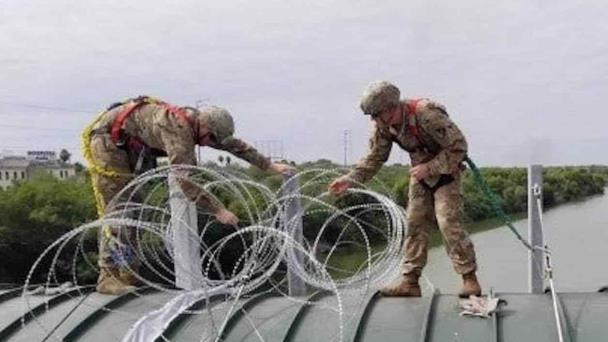 Elementos del Comando Norte de los Estados Unidos, responsable de la defensa nacional, instalan alambradas de protección en el río Bravo.