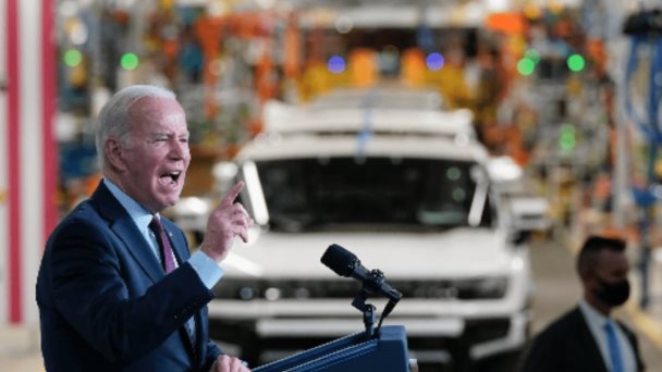 Joe Biden habla durante una visita a la planta de ensamblaje de vehículos eléctricos.