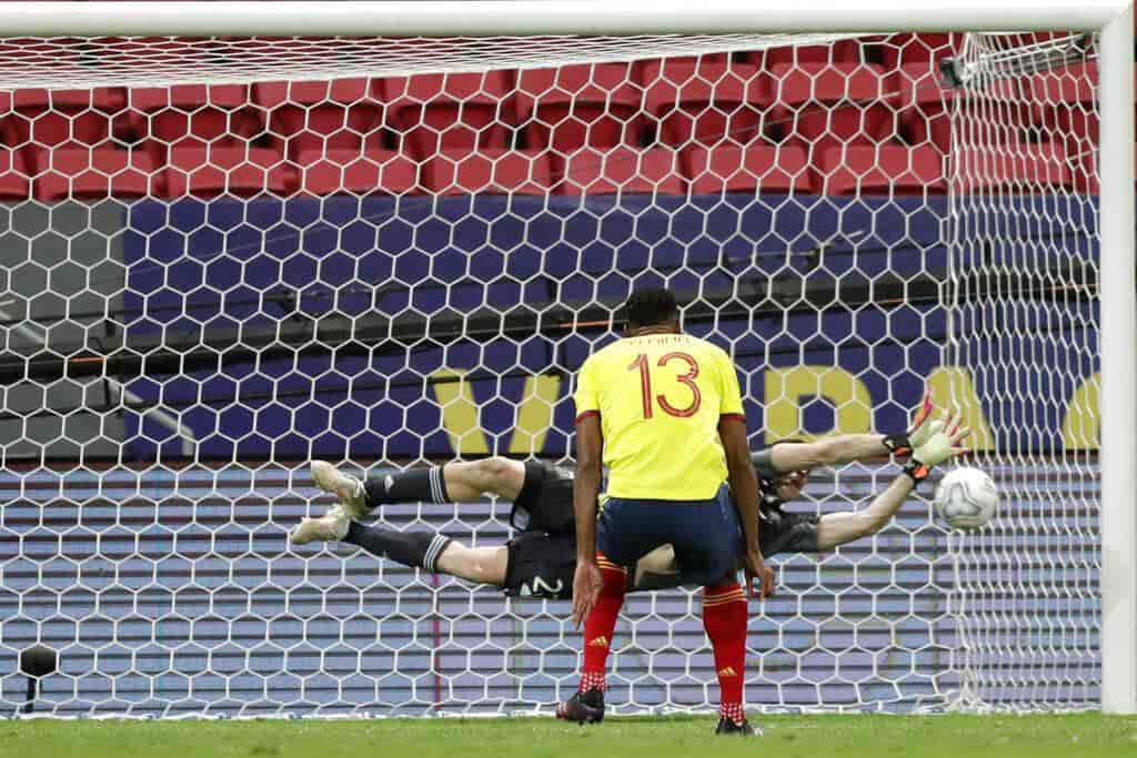 La primera llegada de peligro fue un remate con la cabeza de Yerry Mina, quien al 37' mandó el balón al larguero, haciendo inútil el lance del guardameta Emiliano Martínez.