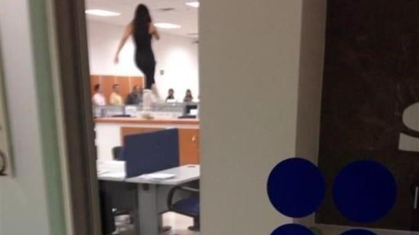 En la imagen se observa a una mujer vestida de negro bailando arriba de un escritorio frente a un grupo de personas en las instalaciones del SAT. Foto: Internet