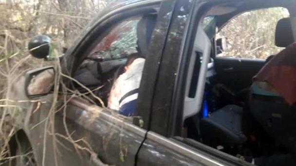 El vehículo de los ministeriales quedó entre el bosque a un lado de la Carretera, por lo que se presume intentaban darse a la fuga de los agresores.