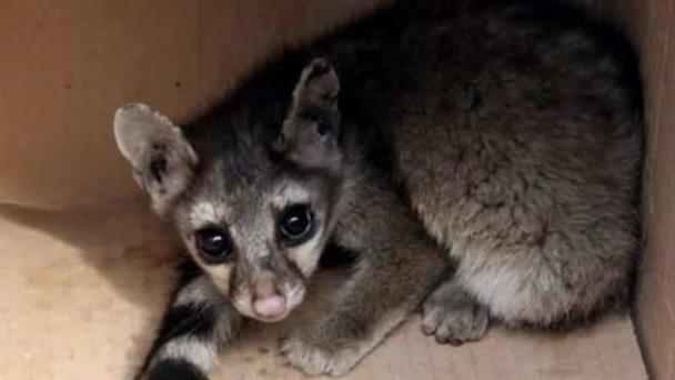 El cacomixtle presenta manchas de sangre y permanece en una caja de cartón, en espera de que acudan por él personal de la Brigada de Vigilancia Animal