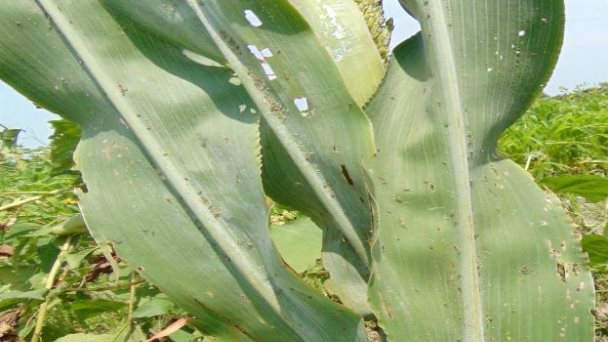 Explica que al estar ya las plantas de sorgo y maíz con un desarrollo normal de acuerdo al proceso, da sombra a los alrededores y esto impide que el florecimiento de hierba y con esto, también la proliferación de plagas.