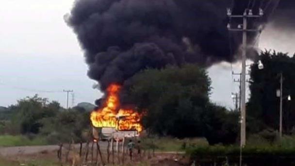 El contingente, que se presume fue convocado por grupos criminales, cruzó las unidades, una incendiándose, sobre esta carretera y caminos cercanos, a la altura del Municipio de Buenavista.