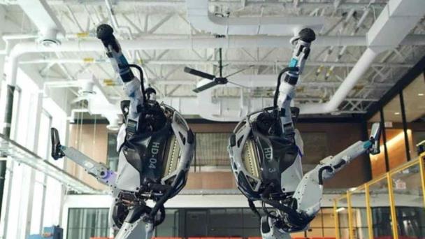 Dos de los modelos humanoides Atlas giran, hacen el paso del puré de papas y otros movimientos clásicos, junto con Spot, un robot con forma de perro, y Handle, un robot con ruedas diseñado para trabajos de almacén.