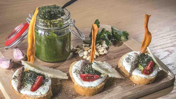 Al sacarlas, colocar el pesto en la base de cada pan, encima poner una rodaja de mozzarella y un trozo de anchoa; meter al horno a fundir.