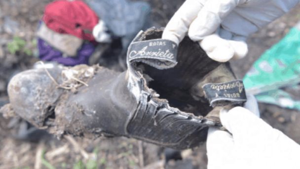 Salen varias prendas de vestir tras rascar la tierra: cinco playeras –dos azules, una morada, de mujer, una negra Burberry y una verde de futbol con el rotulo nítido “Autopartes Gómez”–, un chaleco beige y retazos de alfombra. Ningún resto óseo humano, pero sí algunos huesos que antropólogos forenses aseguran que pertenecen a una res. A unos cientos de metros de ahí, un par de “palazos en la tierra” fue suficiente para sacar una playera con manchas de sangre.