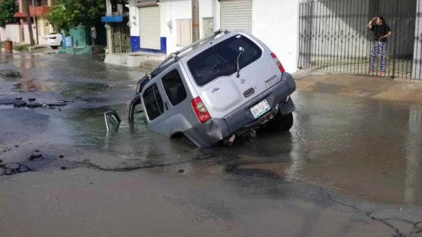 La unidad que cayó al hoyo que se generó el suelo, es una Xterra de la marca Nissan en color gris, misma que sufrió daños materiales al hundirse al momento de pasar por este lugar.