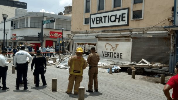 Tampico, Tam.- Una joven mujer murió y un hombre resultó con serias lesiones luego del desplome de enorme marquesina de una boutique y una joyería en plena zona centro de la ciudad.