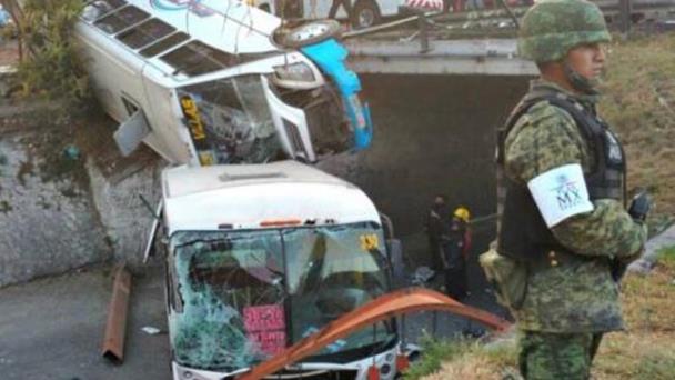 Dos unidades de transporte público que circulaban sobre la autopista México-Pachuca, a la altura del kilómetro 33 cayeron hacia un paso a desnivel, en el poblado de San Pablo Tecalco y el saldo preliminar es de una persona muerta y aproximadamente 50 heridos.