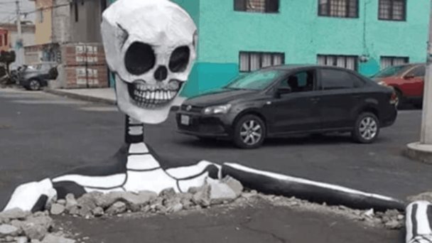 CIUDAD DE MÉXICO.- En redes sociales circula la versión de que vecinos de la alcaldía Tláhuac aprovecharon los baches que hay en la demarcación para colocar calaveras gigantes por el Día de Muertos.