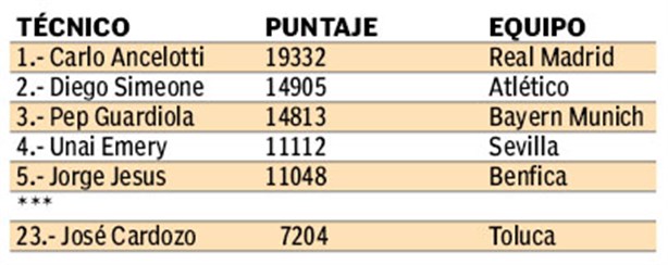 La lista la encabeza el italiano Carlo Ancelotti, que dirige al Real Madrid, seguido del argentino Diego Simeone, quien está en el banquillo del Atlético de Madrid, y del español Pep Guardiola, mandamás del Bayern Munich.