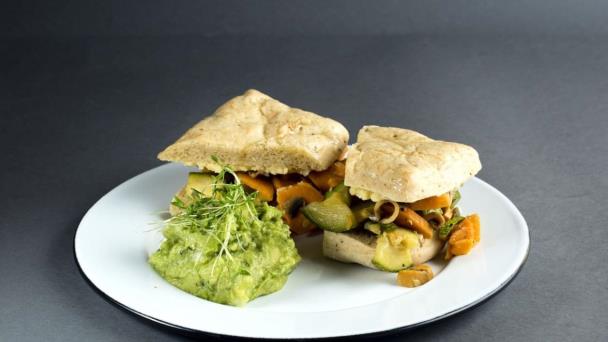 Cortar la chapata por la mitad y tostar. Cortar las verduras en rodajas. Asar en un sartén caliente con un poco de aceite de oliva. Untar una de las tapas del pan con el humus y la otra con el guacamole. Colocar las verduras dentro de la chapata y disfrutar caliente.