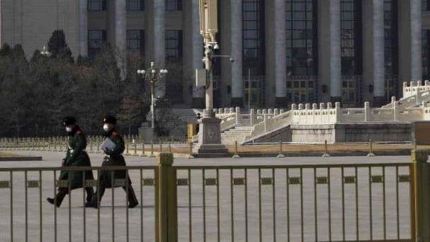 En esta imagen del domingo 23 de febrero de 2020, policías paramilitares con mascarillas de protección caminan por la vacía plaza de Tiananmen, con el Gran Salón del Pueblo al fondo, en Beijing, China. (AP Foto/Andy Wong)
