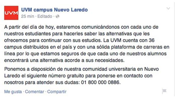 La Universidad de Valle de México (UVM) comunicó esta tarde por medio de su página en Facebook el cierre del campus en la localidad.