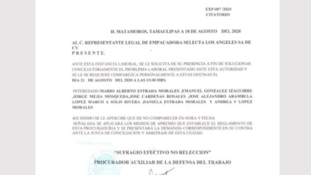 Fue el domingo cuando los trabajadores fueron visitados por el licenciado Alberto Ávila, inspector de la Secretaría del Trabajo, quién asesoró a los empleados y el martes por la tarde, se citó a la representación legal de la empresa para este viernes a las 13:00 horas en la vecina ciudad de Matamoros, esperando que se llegue a un acuerdo conciliatorio.