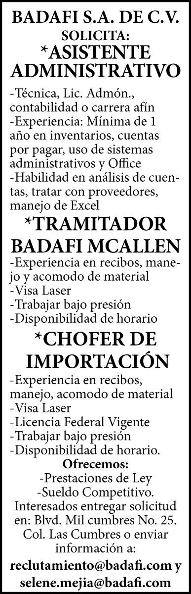 badafi s.a. de c.v. solicita: *asistente administrativo -tecnica, lic. admon., contabilidad o carrera a fin -experiencia: minima de 1 año en inventarios, cuentas por pagar, uso de sistemas administrativos y office -habilidad en analisis de cuentas, tratar con proveedores, manejo de excel *tramitador badafi mc allen -experiencia en recibos, manejo y acomodo de material -visa laser -trabajar bajo presion -disponibilidad de horario *chofer de importacion -experiencia en recibos, manejo, acomodo de material -visa laser -licencia federal vigente -trabajar bajo presion -disponibilidad de horario. ofrecemos: -prestaciones de ley -sueldo competitivo. interesados entregar solicitud en: blvd. mil cumbres no. 25. col las cumbres o enviar informacion a: reclutamiento@badafi.com y selene.mejia@badafi.com