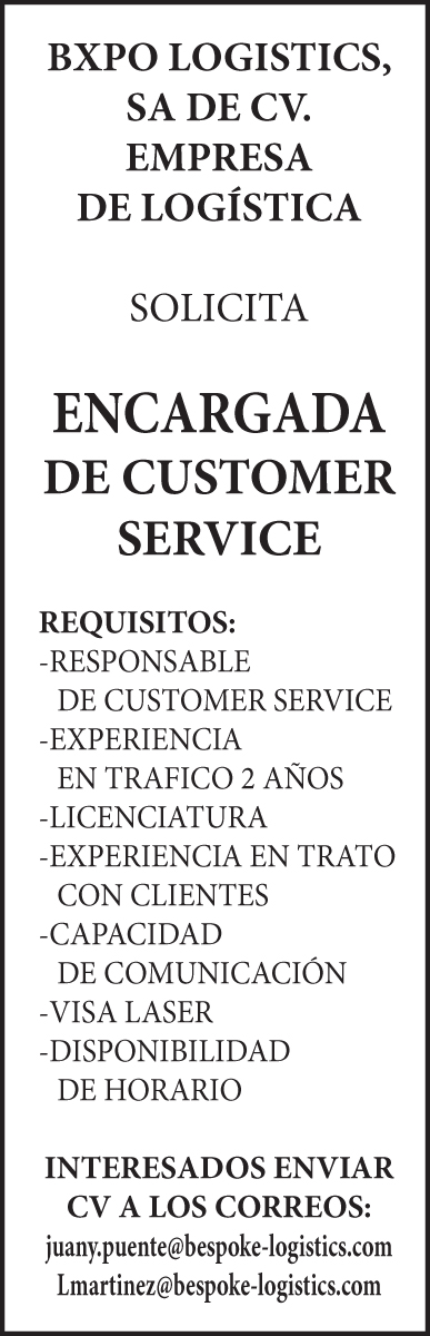 bxpo logistics, sa de cv. empresa de logistica solicita: *encargada de customer service. requisitos: -responsable de customer service -experiencia en trafico 2 años -licenciatura -experiencia en trato con clientes -capacidad de comunicacion -visa laser -disponibilidad de horario interesados enviar cv a los correos: juany.puente@bespoke-logistics.com lmartinez@bespoke-logistics.com