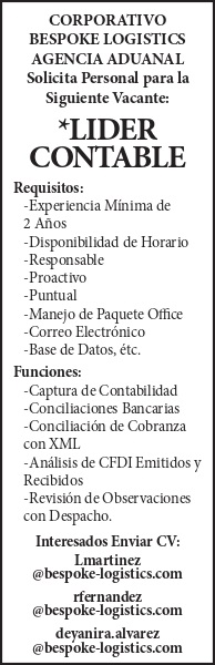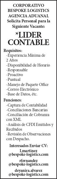 corporativo bespoke logistics agencia aduanal solicita personal para la siguiente vacante: *lider contable requisitos: -experiencia minima de 2 años -disponibilidad de horario -responsable -proactivo -puntual -manejo de paquete office -correo electronico -base de datos, etc. funciones: -captura de contabilidad -conciliaciones bancarias -conciliacion de cobranza con xml -analisis de cfdi emitidos y recibidos -revision de observaciones con despacho. interesados enviar cv: lmartinez@bespoke-logistics.com rfernandez@bespoke-logistics.com deyanira.alvarez@bespoke-logistics.com