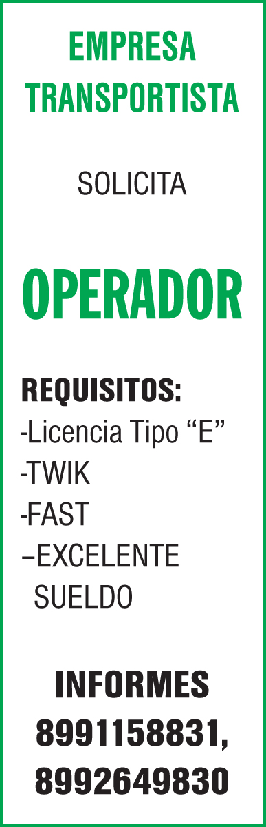 empresa transportista solicita: *operador -requisitos: licencia tipo e -twik -fast excelente sueldo informes 8991158831, 8992649830