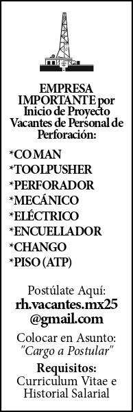 (logo) empresa importante por inicio de proyecto vacantes de personal de perforacion: *co man *toolpusher *perforador *mecanico *electrico *encuellador *chango *piso (atp) postulate aqui: rh.vacantes.mx25@gmail.com colocar en asunto; cargo a postular requisitos; curriculum vitae e historial salarial