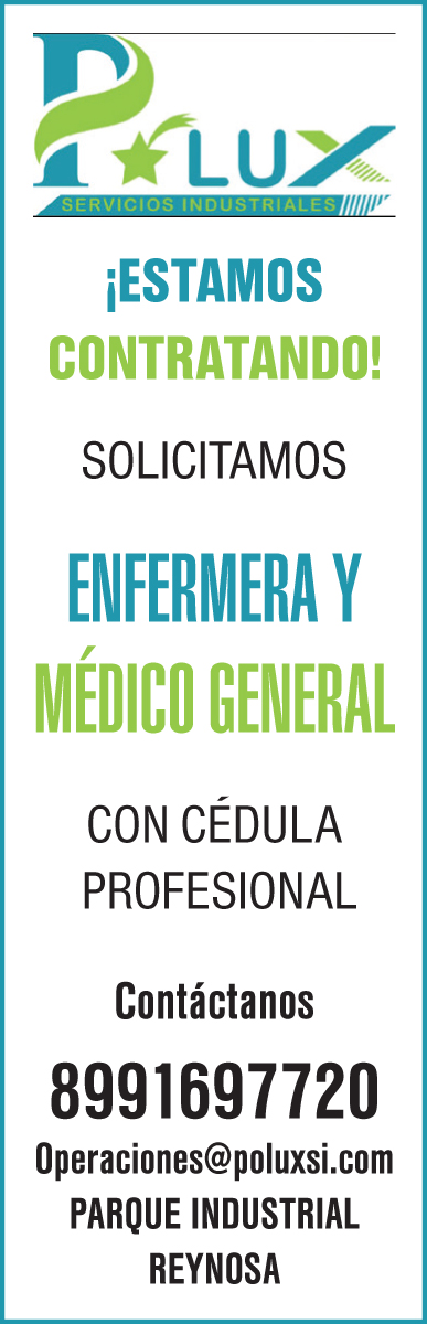 (logo) ¡estamos contratando! solicitamos: enfermera y medico general con cedula profesional, contactanos. 8991697720 o peraciones@poluxsi.com parque industrial reynosa