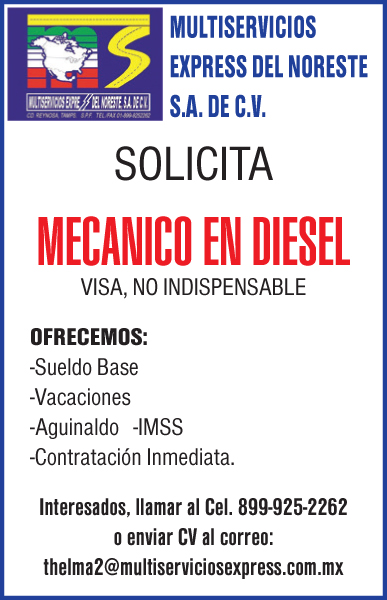 (logo) multiservicios express del noreste sa de cv solicita : *mecanico en diesel visa no indispensable ofrecemos: -sueldo base -vacaciones-aguinaldo -imss -contratacion inmediata.. interesados, llamar al cel: 899-925-2262 o enviar cv al correo: thelma2@multiserviciosexpress.com.mx