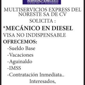 (logo) multiservicios express del noreste sa de cv solicita : *mecanico en diesel visa no indispensable ofrecemos: -sueldo base -vacaciones-aguinaldo -imss -contratacion inmediata.. interesados, llamar al cel: 899-925-2262 o enviar cv al correo: thelma2@multiserviciosexpress.com.mx