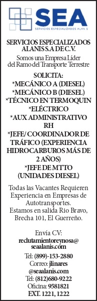 (logo) servicios especializados alanis s.a de c.v somos una empresa lider del ramo del transporte terrestre solicita: *mecanico a (diesel) *mecanico b (diesel) *tecnico en termoquin *electrico *aux administrativo rh *jefe/ coordinador de trafico (experiencia hidrocarburos mas de 2 años) *jefe de mtto (unidades diesel) todas las vacantes requieren experiencia en empresas de autotransportes. estamos en salida rio bravo, brecha 101, el guerreño. envia cv: reclutamientoreynosa@seaalanis.com tel: (899)153-2880 correo: jlinares@seaalanis.com tel: (812)680 9222 oficina: 9581821 ext. 1221, 1222