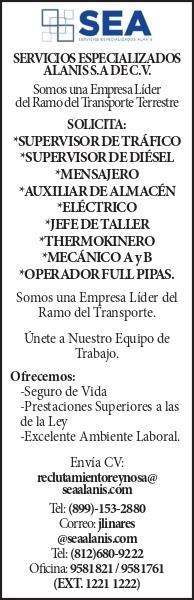 (logo) servicios especializados alanis s.a de c.v somos una empresa lider del ramo del transporte terrestre solicita: *supervisor de trafico *supervisor de disel *mensajero *auxiliar de almacen *electrico *jefe de taller *thermokinero *mecanico a y b *operador full pipas. somos una empresa lider del ramo del transporte. unete a nuestro equipo de trabajo. ofrecemos: -seguro de vida -prestaciones superiores a las de la ley -excelente ambiente laboral. envia cv : reclutamientoreynosa@seaalanis.com tel: (899)153 2880 correo: jlinares@seaalanis.com tel: (812) 680 9222 oficina: 9581821 / 9581761 (ext. 1221 1222)