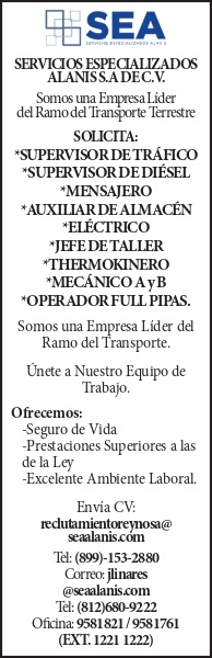 (logo) servicios especializados alanis s.a de c.v somos una empresa lider del ramo del transporte terrestre solicita: *supervisor de trafico *supervisor de disel *mensajero *auxiliar de almacen *electrico *jefe de taller *thermokinero *mecanico a y b *operador full pipas. somos una empresa lider del ramo del transporte. unete a nuestro equipo de trabajo. ofrecemos: -seguro de vida -prestaciones superiores a las de la ley -excelente ambiente laboral. envia cv : reclutamientoreynosa@seaalanis.com tel: (899)153 2880 correo: jlinares@seaalanis.com tel: (812) 680 9222 oficina: 9581821 / 9581761 (ext. 1221 1222)
