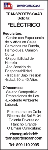 (logo) transportes caar solicita: *electrico requisitos: -contar con experiencia de 5 años en cajas, camiones 5ta rueda, remolques, camion corto -disponibilidad de horario -alto sentido de responsabilidad -trabajar bajo presion -edad: 30 a 45 años. ofrecemos: -salario competitivo -prestaciones de ley -excelente ambiente laboral. presentarse calle riberas del sol #104 colonia riveras de rancho grande o enviar curriculum: rhyseguridad@transportescaar.com tel:8991102095
