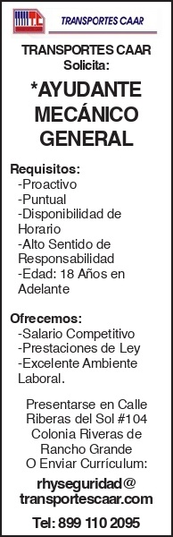 (logo) transportes caar solicita: *ayudante mecanico general requisitos: -proactivo -puntual -disponibilidad de horario -alto sentido de responsabilidad -edad :18 años en adelante ofrecemos: -salario competitivo -prestaciones de ley -excelente ambiente laboral. presentarse en calle riberas del sol #104 colonia riveras de rancho grande o enviar curriculum: rhyseguridad@transportescaar.com tel:8991102095