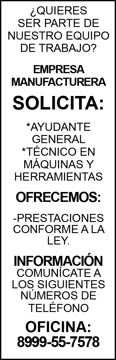 ¿quieres ser parte de nuestro equipo de trabajo? empresa manufacturera solicita: *ayudante general *tecnico en maquinas y herramientas ofrecemos: -prestaciones conforme a la ley. informacion comunicate a los siguientes numeros de telefono oficina: 8999-55-7578