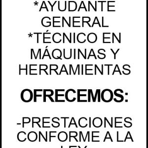 ¿quieres ser parte de nuestro equipo de trabajo? empresa manufacturera solicita: *ayudante general *tecnico en maquinas y herramientas ofrecemos: -prestaciones conforme a la ley. informacion comunicate a los siguientes numeros de telefono oficina: 8999-55-7578