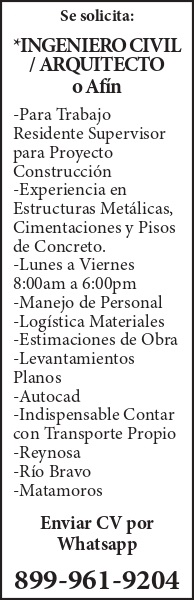 se solicita: *ingeniero civil / arquitecto o afin -para trabajo residente supervisor para proyecto construccion -experiencia en estructuras metalicas, cimentaciones y pisos de concreto. -lunes a viernes 8:00am a 6:00pm -manejo de personal -logistica materiales -estimaciones de obra -levantamientos planos -autocad -indispensable contar con transporte propio -reynosa -rio bravo -matamoros. enviar cv por whatsapp 899-961-9204