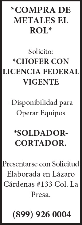 solicito: *chofer con licencia federal vigente -disponibilidad para operar equipos *soldador-cortador. presentarse con solicitud elaborada en lazaro cardenas #133 col. la presa. *//compra de metales el rol//* 8999260004