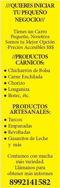 ///quieres iniciar y tu pequeño negocio/// tienes un carro pequeño, nosotros somos tu mejor opcion -precios accesibles $$$ //productos carnicos; -chicharron de bolsa -carne enchilada chorizo longaniza bistec etc.. productos artesanales; -turcos empanadas revoltadas -gusanitos de leche y mas. contamos con mucha mas variedad .. llamanos para obtener mas info. 8992141582