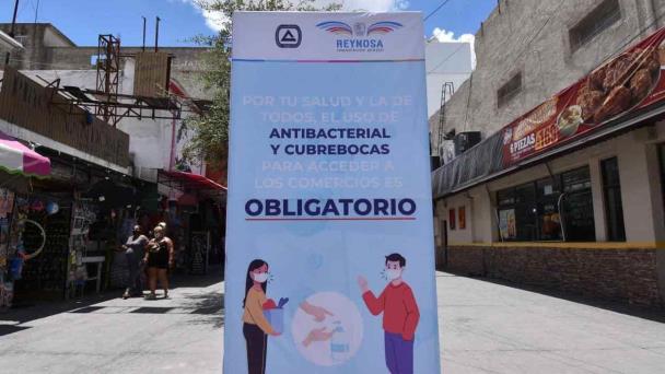 Previo a que se coloquen los filtros sanitarios en las calles de la zona centro de Reynosa, autoridades han colocado carteles para fomentar el uso de cubrebocas, gel antibacterial y distanciamiento entre los transeúntes, a fin de prevenir casos de Covid-19.